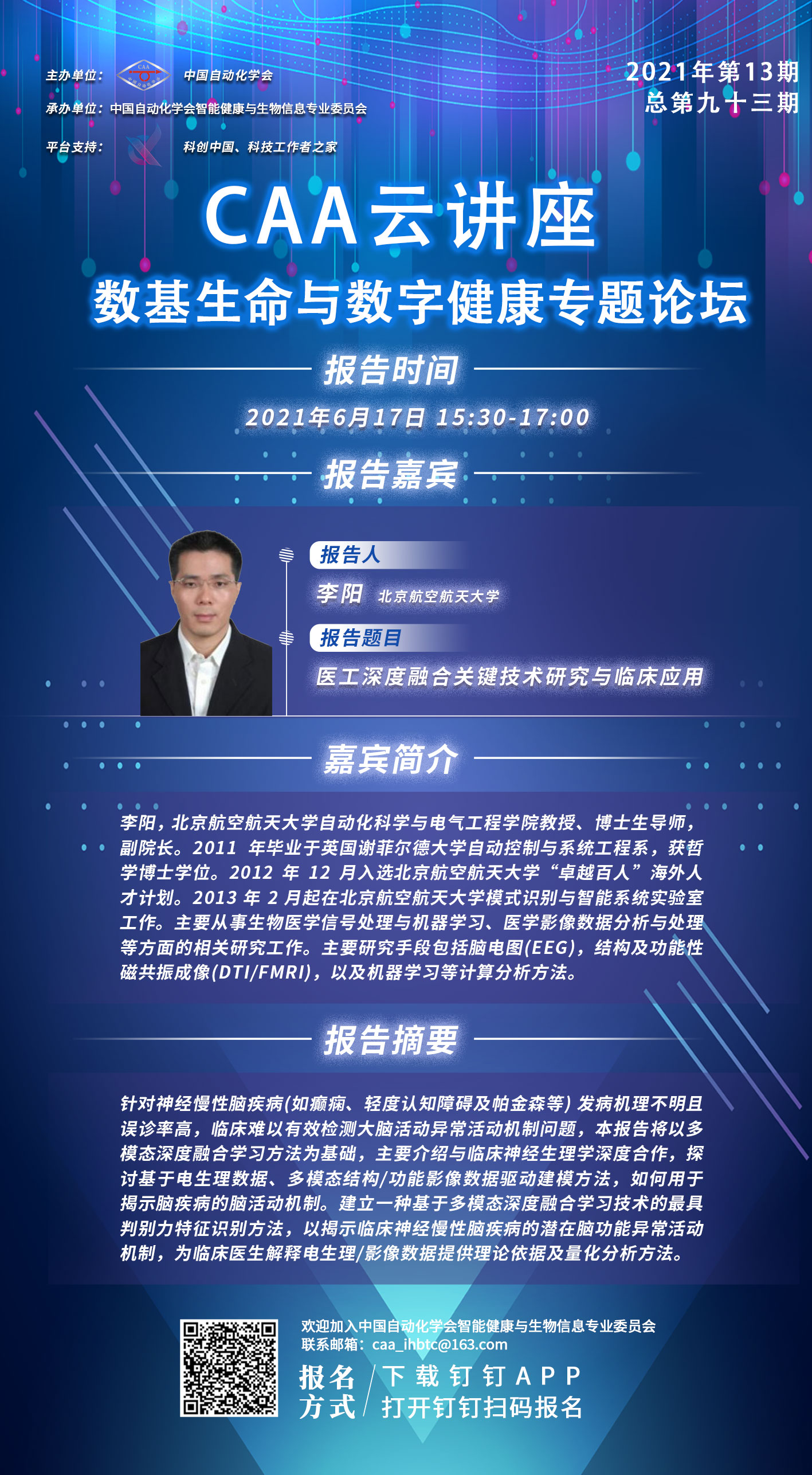 由中國自動化學會主辦,CAA智能健康與生物信息專委會承辦的CAA云講座—數基生命與數字健康專題論壇正式開講。首場講座將于2021年6月17日下午15:30-17:00舉行,由北京航空航天大學的李陽教授帶來報告:醫工深度融合關鍵技術研究與臨床應用。精彩內容,敬請期待!
