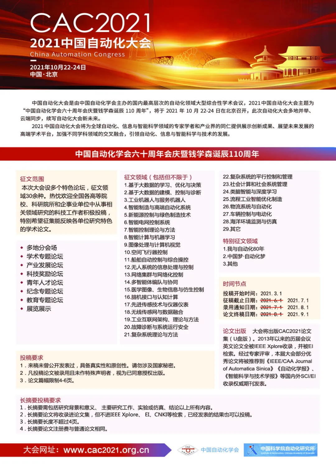 2021年3月1日,CAC2021網站正式上線,投稿系統正式開放,應廣大科技工作者強烈要求,征稿延期至7月1日,征稿火熱進行中,熱忱歡迎各界人士投稿!