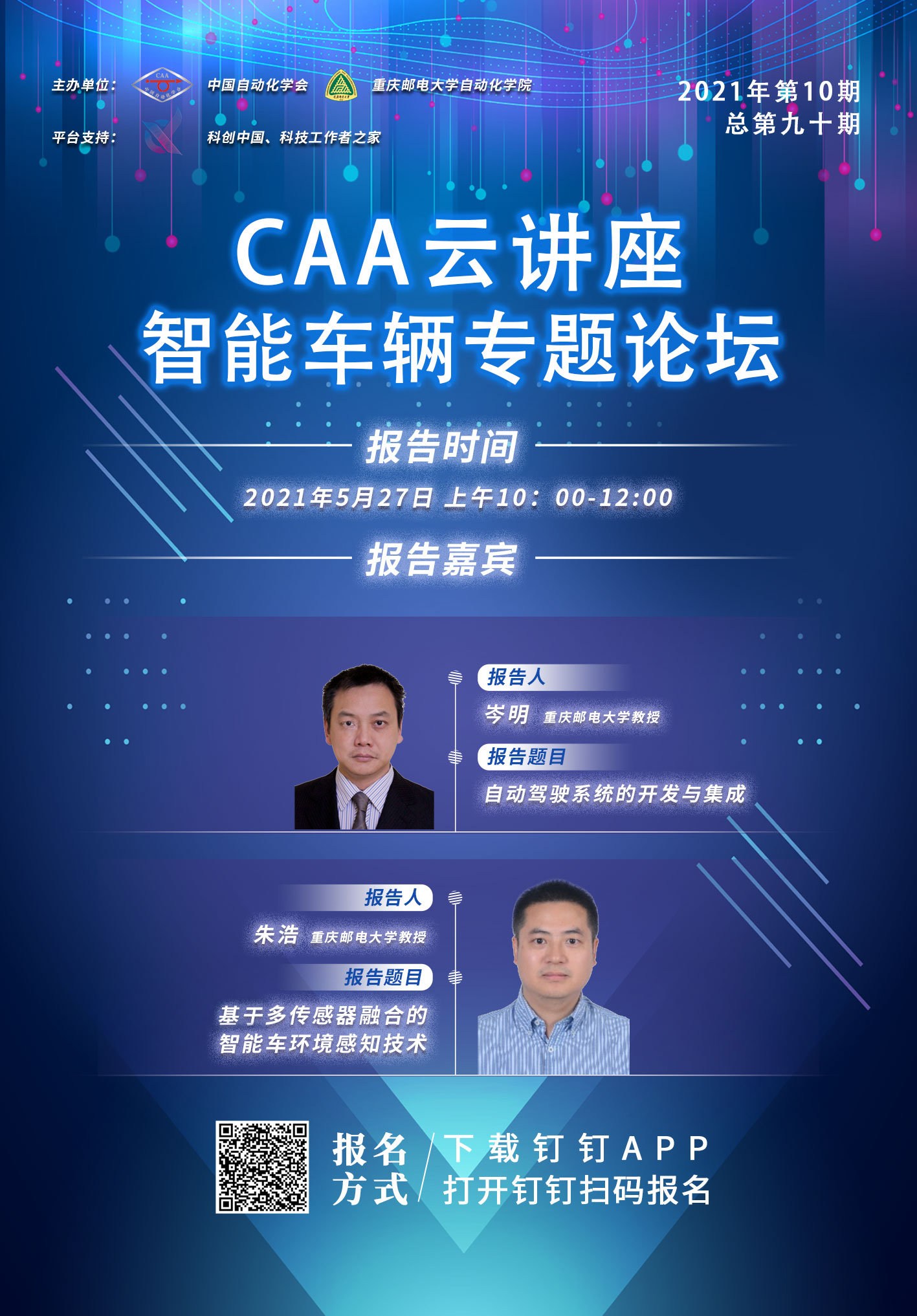 由中國自動化學會和重慶郵電大學自動化學院聯合舉辦的CAA云講座—智能車輛專題論壇,將于2021年5月27日上午10:00-12:00舉行。本次論壇由重慶郵電大學教授岑明帶來報告“自動駕駛系統的開發與集成”,重慶郵電大學教授朱浩帶來報告“基于多傳感器融合的智能車環境感知技術”。精彩內容,敬請期待!