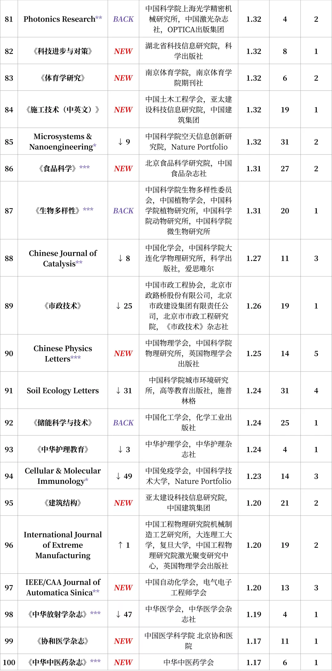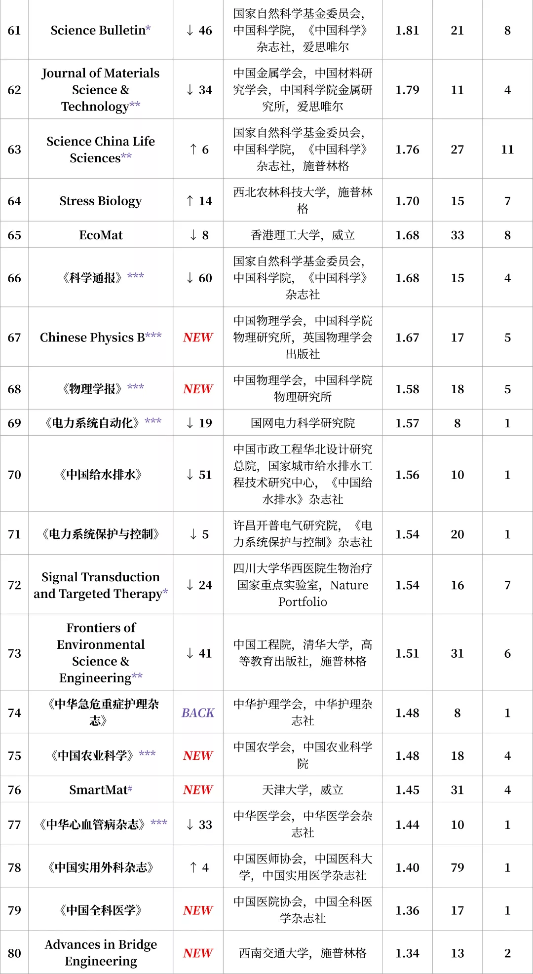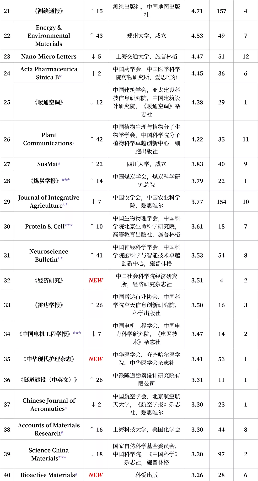 注 :英文期刊以其英文名稱表示,中文期刊以其中文名稱表示。入選“中國科技期刊卓越行動計劃“的期刊,在其名稱的右上角以特殊符號進行標記,分別為*(領軍期刊)、**(重點期刊)、***(梯隊期刊)、#(高起點新刊)。