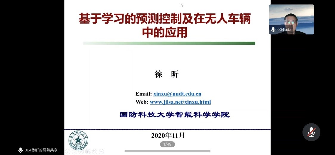 國防科技大學徐昕教授作“基于學習的預測控制及在無人車輛中的應用”報告。徐昕教授團隊針對智能系統的學習與預測問題,在此次報告中詳細介紹了基于模型學習的預測控制、數據驅動的無人車輛建模方法、以及學習型預測控制在無人車輛中的應用,并對這一方面的未來研究工作方向進行了探討。主持人余翔教授對報告內容進行了總結,并指出學習預測使無人車更加智能。