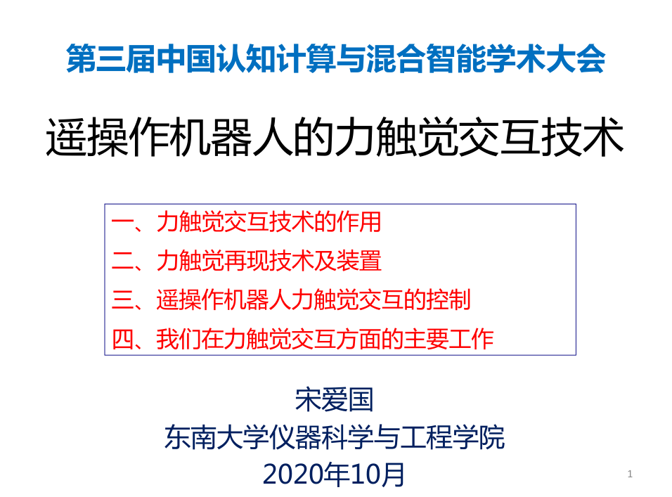 宋愛國教授的報(bào)告主題是“遙操作機(jī)器人的力觸覺交互技術(shù)”。報(bào)告介紹了力觸覺交互技術(shù)對于人機(jī)交互機(jī)器人的重要意義、力觸覺再現(xiàn)技術(shù)及裝置的發(fā)展現(xiàn)狀,以及遙操作機(jī)器人力觸覺交互的控制問題。最后,宋教授介紹了他的科研團(tuán)隊(duì)在遙操作機(jī)器人力觸覺交互方面的關(guān)鍵技術(shù):力觸覺感知、力觸覺再現(xiàn)、力反饋控制等,并簡要介紹了自己科研團(tuán)隊(duì)的一些典型應(yīng)用工作。