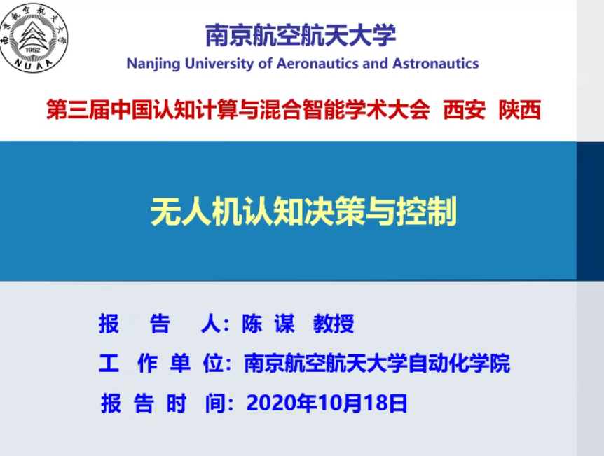 陳謀教授的報(bào)告題目是“無人機(jī)認(rèn)知決策與控制”。陳教授介紹認(rèn)知原理在無人機(jī)目標(biāo)意圖識別、攻擊決策和智能飛行控制等方面的應(yīng)用及其研究發(fā)展。陳教授講到認(rèn)知過程是主體的自我控制過程,通過排除環(huán)境變化產(chǎn)生的干擾,使認(rèn)識符合主體的目的,其主要表現(xiàn)為信息的獲取、儲存、加工處理、變換和反饋等思維操作活動(dòng)。因此,對認(rèn)識控制過程進(jìn)行模擬并應(yīng)于無人機(jī)決策與控制中必將發(fā)揮重要的作用。