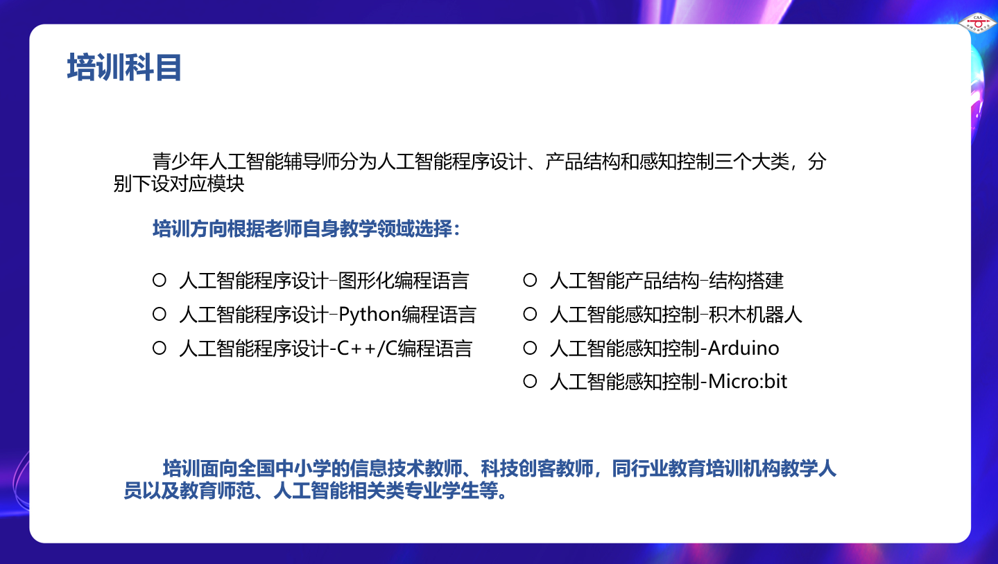 為貫徹落實國務院《新一代人工智能發(fā)展規(guī)劃》和《全民科學素質(zhì)行動規(guī)劃綱要(2021-2035年)》中的有關(guān)要求,推進人工智能教育的普及,助力人工智能時代所需的人才培養(yǎng),培養(yǎng)相關(guān)師資和裁判人才,中國自動化學會發(fā)起了青少年人工智能輔導師和青少年人工智能活動裁判員的培訓工作。本期培訓時間為2022年10月24日至11月5日,隨即在11月6日進行培訓后的考核,報名參加課程培訓并在考核中成績合格的學員,將獲得由中國自動化學會頒發(fā)的“青少年人工智能輔導師證書”或“青少年人工智能活動裁判員證書”。