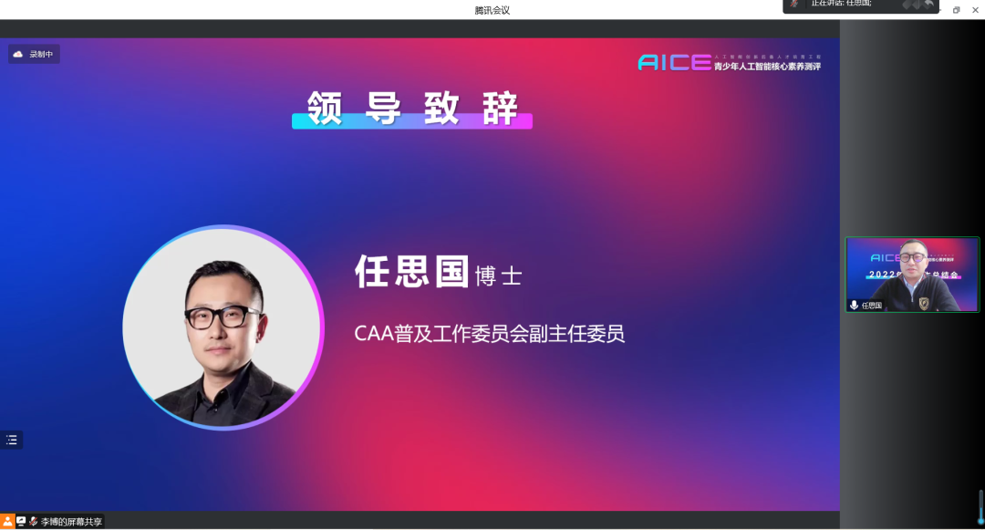 2023年1月6日,由中國自動化學會主辦,中國自動化學會普及工作委員會和中國自動化學會智慧教育專業委員會承辦的“人工智能創新后備人才培育工程”之“青少年人工智能核心素養測評”在線上召開了2022年度工作總結大會。大會由領導專家致辭、人工智能主題報告、頒獎儀式、教學經驗分享、測評年度工作總結、測評項目經驗分享等幾方面內容組成。來自測評主辦單位、學術指導單位、承辦單位的領導,聯合發起單位、運營單位、共建示范校、測評運營中心、測評基地的專家和老師們,共計300余人參加了本次大會。