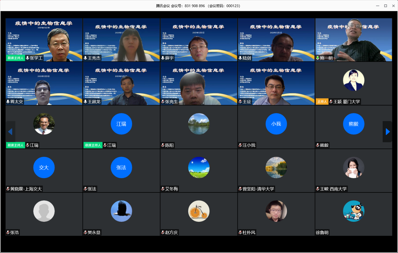2020年5月5日晚,由中國人工智能學會、中國生物工程學會、中國自動化學會聯合主辦的“疫情下的生物信息學”學術研討會,在騰訊會議平臺線上召開。本次會議由清華大學張學工教授發起,中國人工智能學會生物信息學與人工生命專委會、中國生物工程學會計算生物學與生物信息學專委會、中國自動化學會智能健康與生物信息專委會(籌)與清華大學北京信息國家研究中心、華中科技大學生命科學與技術學院共同承辦。來自全國45所高等院校和科研院所的一百多位生物信息學領域的專家學者參加了會議,人工智能學會理事長、清華北京信息國家研究中心主任戴瓊海院士出席了會議,國家自然科學基金委信息學部張兆田主任、生命學部谷瑞升副主任以及兩個學部的潘慶處長、宋朝暉處長和王璞玥處長應邀參加了會議,張兆田、谷瑞升在會議結束時作了總結講話。