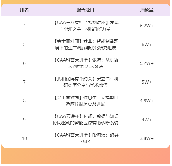 學術無邊界,探索無止境。2023年中國自動化學會線上線下聯動,繼續創辦多元化的CAA線上學術交流活動,加深學術交流。2023年第一季度學會共舉辦CAA云講座5期,會士面對面4期,CAA科普大講堂2期,CAA YeS論壇、我和優博有個約會各1期,邀請了20余位專家學者在線分享前沿學術熱點、最新研究成果、行業應用、學術經驗等內容,不僅得到了廣大科技工作者的廣泛關注與熱情討論,各類線上會議的觀看數量也再次刷新歷史記錄,累計超過70萬人次觀看。