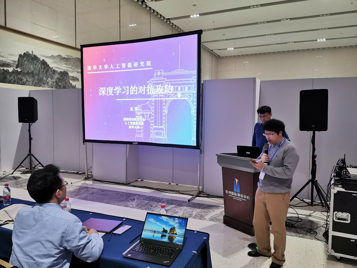 本次大會由中國自動化學(xué)會模式識別與機(jī)器智能專委會副主任、北京大學(xué)林宙辰教授主持。在會議中,首位分享嘉賓為清華大學(xué)的朱軍教授,他的報告題目是“深度學(xué)習(xí)的對抗攻擊與防御”。研究表明,深度學(xué)習(xí)模型易于被對抗噪聲誤導(dǎo)進(jìn)而發(fā)生錯誤,這一缺陷往往會給深度學(xué)習(xí)在關(guān)鍵領(lǐng)域的應(yīng)用帶來風(fēng)險;另外,深度學(xué)習(xí)模型通常很難被理解。針對這些挑戰(zhàn)性問題,朱軍教授分享了深度神經(jīng)網(wǎng)絡(luò)的對抗攻擊與防守方法,展示了相關(guān)研究成果在人臉識別等重要問題上的應(yīng)用效果。