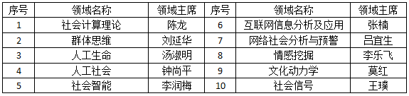 ● 復雜性科學:群體思維與社會智能研究及應用;人工生命與人工社會建模;社會環境下的信任、風險和安全;情感挖掘,文化動力學,網絡環境中信息、情緒與影響傳播過程