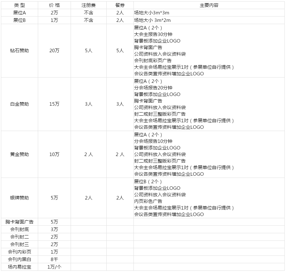 展位A、B 包括三面圍板、企業名稱楣板、一張洽談桌、兩把椅子、兩只射燈(特殊用電請事先聲明,另行收費)。