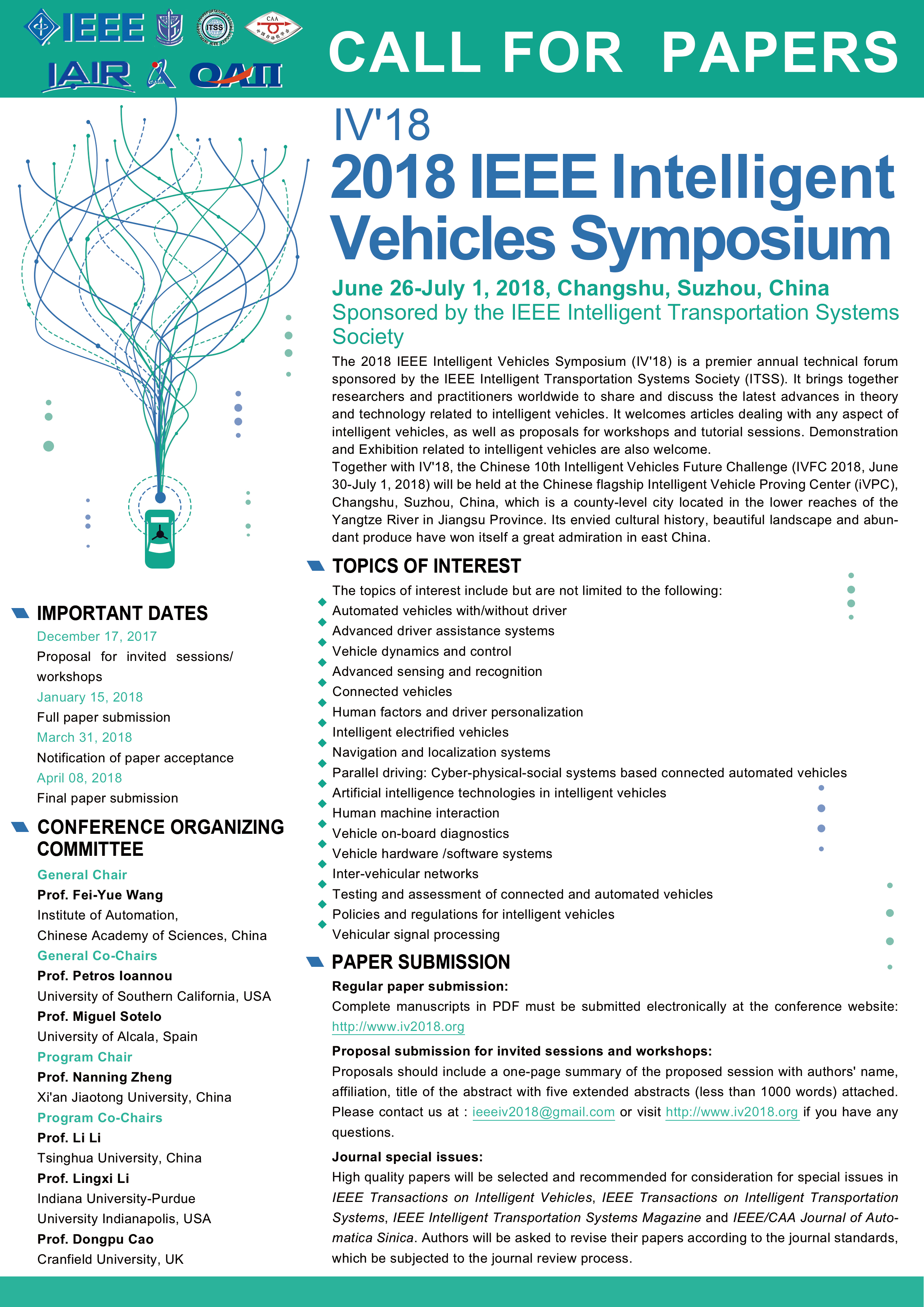 第29屆國際智能車大會(IEEE IV 2018)是由IEEE智能交通系統協會(ITSS)主辦的年度技術論壇。旨在為智能汽車領域的全球研究人員和技術從業人員分享和討論智能汽車相關的理論和最新的技術進展。在大會開始前一天,將舉辦面向智能車輛的若干研討會(workshop)。現面向全球智能車輛從業人員,邀請組織研討會(workshop)、征集研討會(workshop)建議,研討會(workshop)主題不限但須與大會(IEEE IV 2018)征文范圍一致。