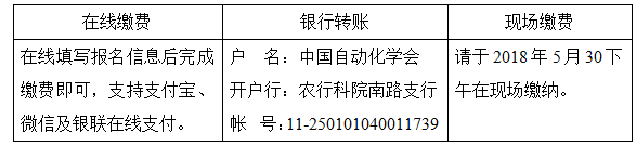 ①2018年05月29日(含)前注冊(cè)并繳費(fèi):自動(dòng)化學(xué)會(huì)會(huì)員2000 元/人,非會(huì)員報(bào)名同時(shí)入會(huì)2500元/人;②現(xiàn)場(chǎng)繳費(fèi):會(huì)員2500元/人,非會(huì)員3000元/人(包含提前報(bào)名現(xiàn)場(chǎng)繳費(fèi)、現(xiàn)場(chǎng)報(bào)名現(xiàn)場(chǎng)繳費(fèi));③在校生參會(huì)可享受學(xué)生優(yōu)惠價(jià)格1200元/人;④公務(wù)卡繳費(fèi)可現(xiàn)場(chǎng)刷卡,但需要提前提交報(bào)名信息方可按優(yōu)惠價(jià)格繳費(fèi);⑤自動(dòng)化學(xué)會(huì)團(tuán)體會(huì)員參加,按會(huì)員標(biāo)準(zhǔn)繳費(fèi);⑥同一單位3人及以上團(tuán)體報(bào)名,按會(huì)員標(biāo)準(zhǔn)繳費(fèi)。