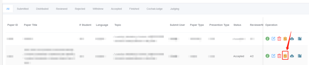 在論文list/operate界面,點擊Final Submit按鈕,根據系統提示完成相關信息完善,上傳終稿論文,完成后點擊“FinalSubmit”按鈕,完成終稿提交。