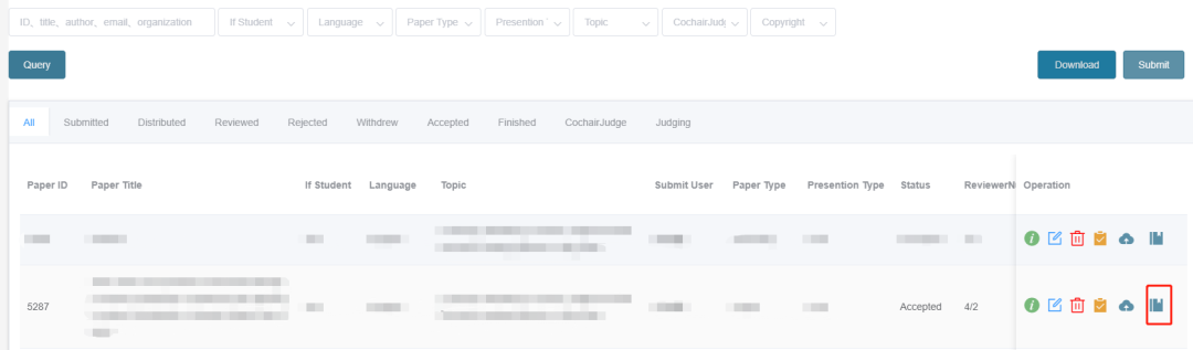 在論文list界面,點擊judge按鈕,進入Paper Judge頁面,點擊Detail即可查看審稿人意見。