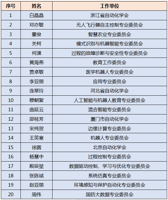 為充分調動廣大通訊員的積極性,全面提升學會宣傳、文化建設和信息工作的效率和質量,中國自動化學會秘書處從互通信息、稿件數量及時效性等方面評選“2019中國自動化學會優秀通訊員”,評選結果如下: