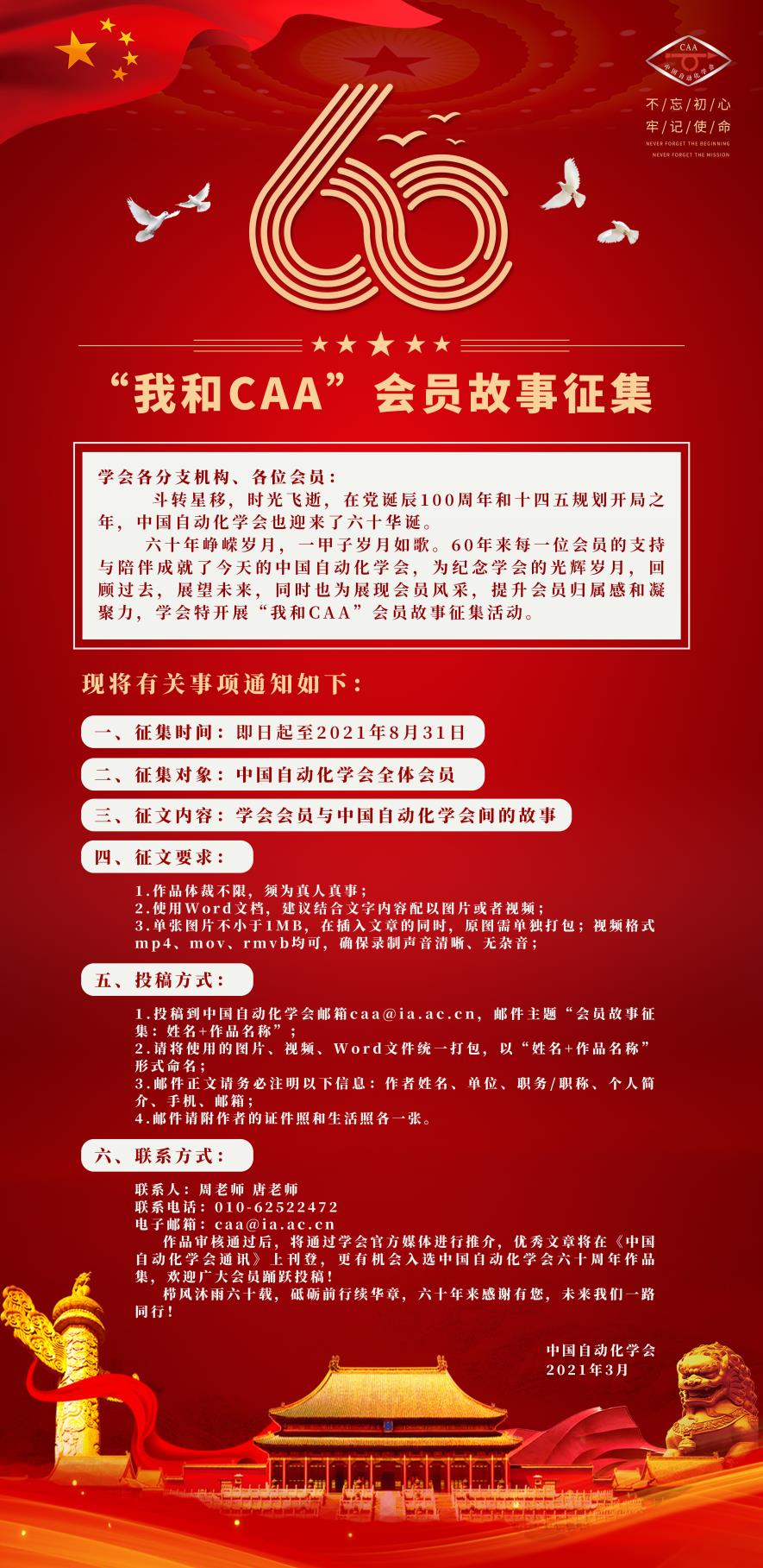 六十年崢嶸歲月,一甲子歲月如歌。60年來每一位會(huì)員的支持與陪伴成就了今天的中國(guó)自動(dòng)化學(xué)會(huì),為紀(jì)念學(xué)會(huì)的光輝歲月,回顧過去,展望未來,同時(shí)也為展現(xiàn)會(huì)員風(fēng)采,提升會(huì)員歸屬感和凝聚力,學(xué)會(huì)特開展“我和CAA”會(huì)員故事征集活動(dòng)。