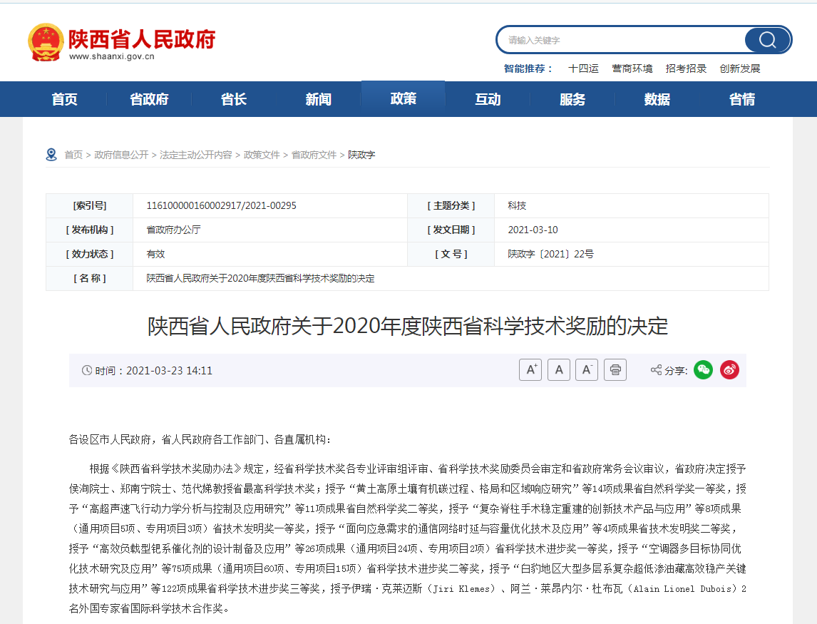 3月23日,陜西省人民政府發(fā)布關(guān)于2020年度陜西省科學技術(shù)獎勵的決定。