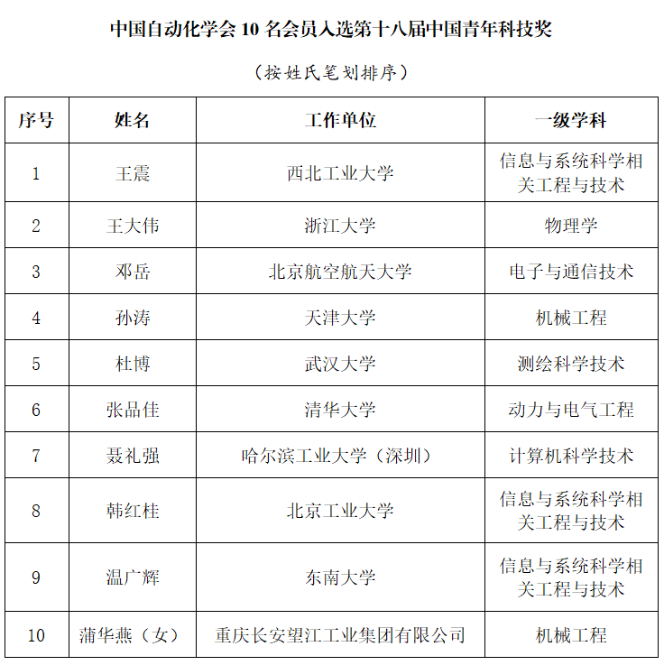 西北工業(yè)大學(xué)教授王震、浙江大學(xué)教授王大偉、北京航空航天大學(xué)教授鄧岳、天津大學(xué)教授孫濤、武漢大學(xué)教授杜博、清華大學(xué)副教授張品佳、哈爾濱工業(yè)大學(xué)(深圳)教授聶禮強、北京工業(yè)大學(xué)教授韓紅桂、東南大學(xué)教授溫廣輝、重慶長安望江工業(yè)集團有限公司蒲華燕入選第十八屆中國青年科技獎,其中韓紅桂教授由中國自動化學(xué)會推薦。