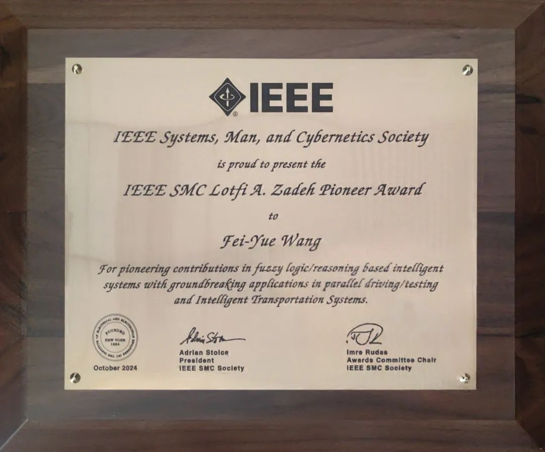 此獎系IEEE SMCS學會所設最高獎項,創立于2014年,以紀念模糊邏輯和計算智能的創始人與開拓者,控制理論狀態方程方法和離散數字控制Z變換的開創者之一,己故美國加州伯克利大學教授Lofti A. Zadeh。(百度百科:https://baike.baidu.com/item/%E6%89%8E%E5%BE%B7/2663145?fr=ge_ala)王飛躍教授因在基于模糊邏輯與推理的智能系統方面的開拓性貢獻以及在平行駕駛與平行測試和智能交通方面的開創性應用(For pioneer contributions in fuzzy logic/reasoning based intelligent systems with groundbreaking applications in parallel driving/testing and intelligent transportation)而獲此獎,是第五位榮獲此獎的國際學者。
