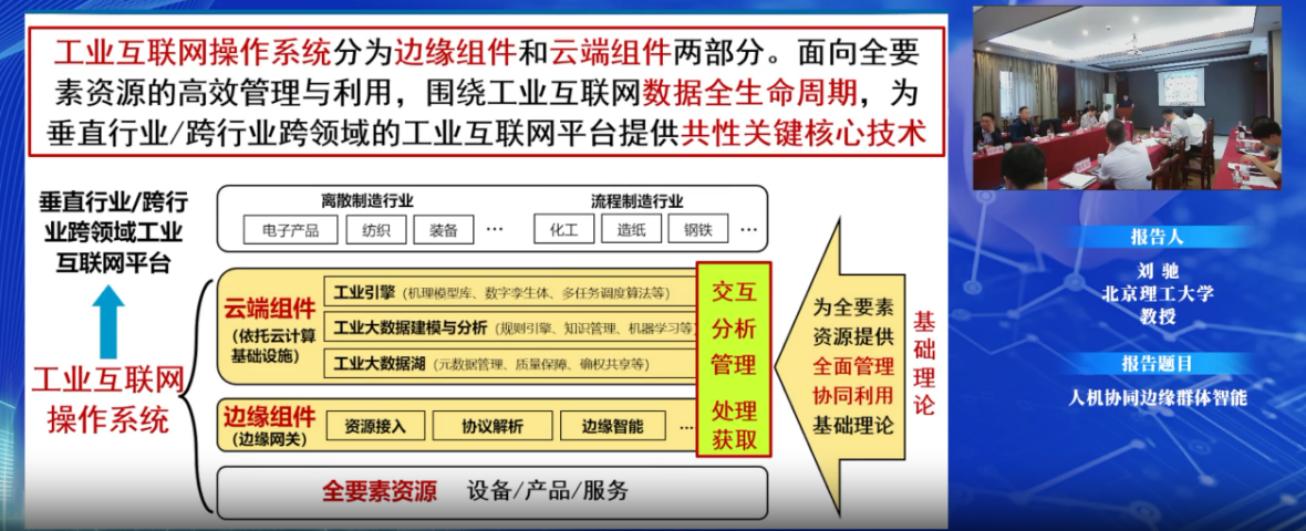 第一個報告人北京理工大學計算機學院副院長劉馳教授帶來題為“離散行業工業互聯網操作系統核心組件研制及應用示范”的報告,報告闡述了工業互聯網操作系統分為邊緣組件和云端組件兩部分,其功能是面向全要素資源的高效管理與利用,圍繞工業互聯網數據全生命周期,為垂直行業/跨行業跨領域的工業互聯網平臺提供共性關鍵核心技術,來解決以電子產品制造為典型代表的離散制造業實現數字化轉型面臨著產品個性化定制、大規模協同制造等應用瓶頸;和以紡織品制造為代表的重要民生產業離散制造業實現數字化轉型面臨著產品質量保障、老舊設備維護等應用瓶頸。