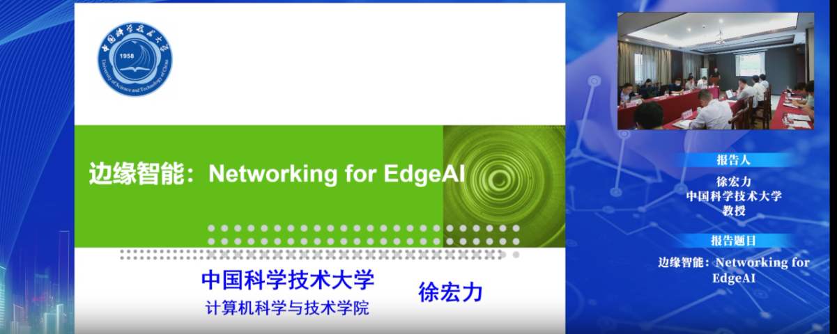 第二位報告人是來中國科學技術大學的徐宏力教授,報告題目為“邊緣智能:Networking for EdgeAI”。報告首先介紹了感知數據進行訓練是實現物聯網與人工智能融合的重要手段,而邊緣計算通過集成網絡、計算、存儲等功能,就近提供模型訓練服務,滿足低時延、高帶寬等需求,為物聯網賦能。我們綜合分析了大數據驅動的邊緣側模型訓練所面臨的需求與挑戰,提出了Networking for EdgeAI的思想,即通過網絡的方法(如資源分配、任務調度等)來提高邊緣環境下模型訓練的性能,然后介紹了邊緣智能下的兩個科學問題及部分關鍵技術。通過對邊緣智能的研究,推動該技術的發展與應用,帶動人工智能與物聯網的嵌合運用。