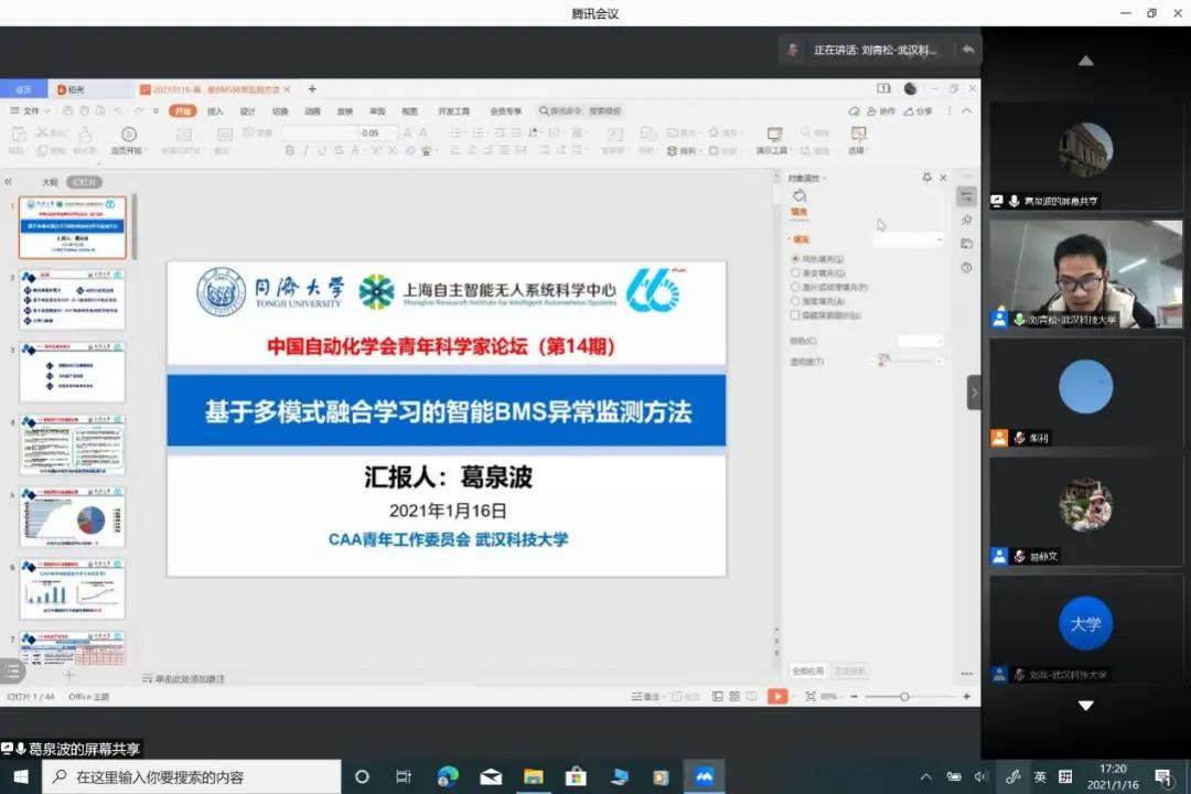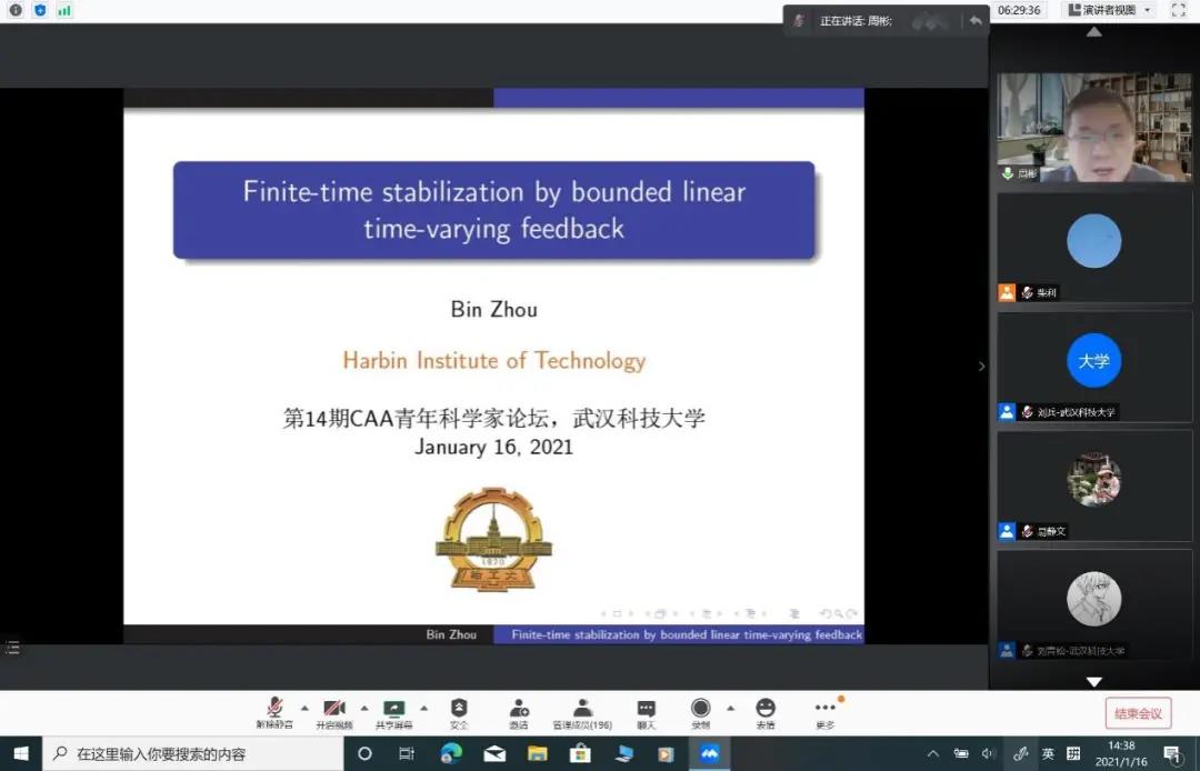 出席本次論壇的有中國自動化學會副秘書長、東南大學孫長銀教授,中國自動化學會青年工作委員會主任、北京科技大學賀威教授,中國自動化學會青年工作委員會副主任、同濟大學葛泉波研究員,清華大學汪小我教授,華中科技大學白翔教授,北京航空航天大學董希旺教授,武漢大學杜博教授,哈爾濱工業大學周彬教授,鄭州大學梁靜教授,北京大學陳偉教授,伊利諾伊大學香檳分校孫若愚教授,武漢科技大學副校長吳懷宇教授,武漢科技大學劉振興教授和武漢科技大學柴利教授。全國各高校、科研院所等共計300余人參加了此次線上論壇。