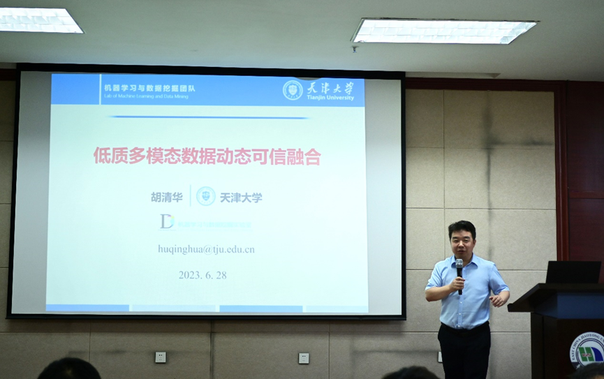 天津大學胡清華教授作了題為“低質多模態數據動態可信融合”的報告,系統梳理了當前多模態數據融合的發展現狀以及存在的問題,分析介紹人腦在處理多感官數據融合時的柔性機制,并介紹當前最前沿的多模態數據動態可信融合的模型、算法和應用。胡教授的報告深入淺出,既有理論深度,又有實踐應用,引起了現場聽眾的強烈共鳴和熱烈討論。