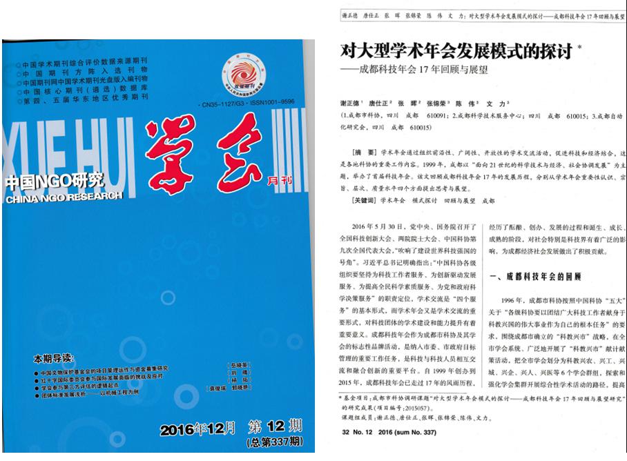 由中國科協(xié)學(xué)會服務(wù)中心、福建省科協(xié)主辦的《學(xué)會》雜志(月刊)于2016年12月在“社會管理工作研究”專欄發(fā)表《對大型學(xué)術(shù)年會發(fā)展模式的探討——成都科技年會17年回顧與展望》一文。論文在回顧成都科技年會17年的發(fā)展歷程的基礎(chǔ)上,對學(xué)術(shù)年會的重要性認(rèn)識、宗旨、層次、質(zhì)量水平四個方面提出思考與展望。
