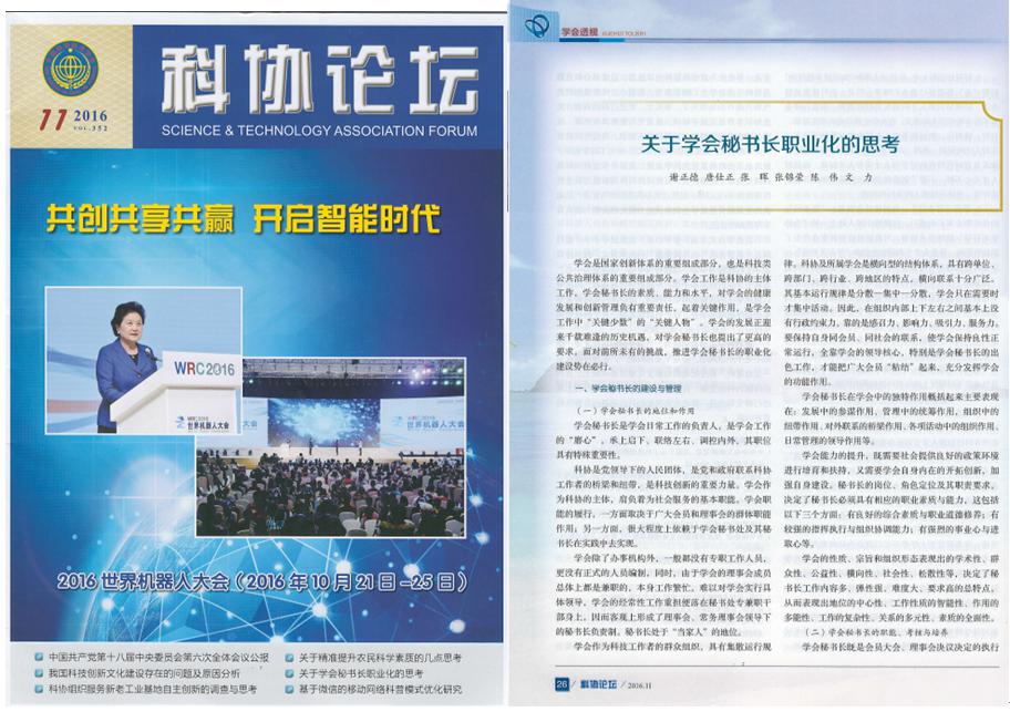 由中國科協(xié)主管的《科協(xié)論壇》雜志(月刊)于2016年11月在“學(xué)會論壇”專欄發(fā)表《關(guān)于學(xué)會秘書長職業(yè)化的思考》一文。論文在對學(xué)會秘書長的地位、作用、能力、素質(zhì)、考核、培養(yǎng)等建設(shè)與管理進(jìn)行多視角分析論述的前提下,對學(xué)會秘書長職業(yè)化的基本概念、內(nèi)涵等進(jìn)行了討論,在結(jié)合成都市科協(xié)學(xué)會秘書長現(xiàn)狀調(diào)研分析后,提出了推進(jìn)學(xué)會秘書長職業(yè)化進(jìn)程的思考與建議。