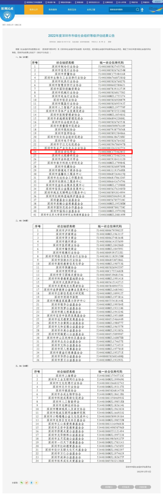 根據《社會組織評估管理辦法》(民政部令第39號)及《深圳市社會組織評估指南》有關規定,市級社會組織評估委員會會議評定確定了2022年度市級社會組織評估等級,深圳自動化學會榮獲深圳市“5A”級社會組織。
