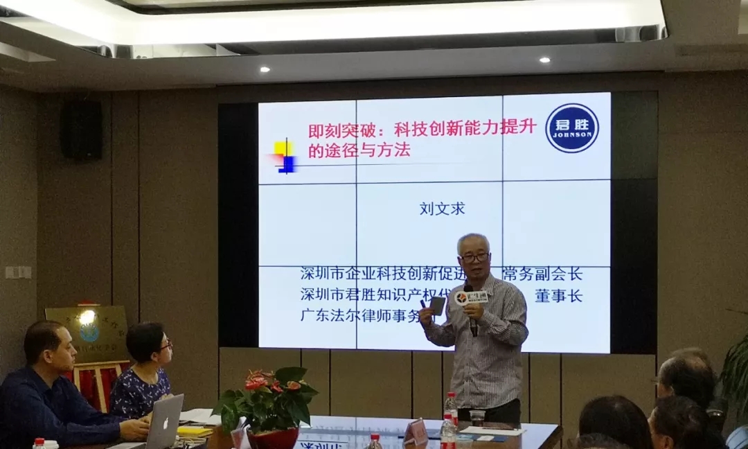 聽完企業實例后,學會還邀請了深圳市君勝知識產權代理事務所董事長劉文求(專利代理人,深圳市企業科技創新促進會常務副會長,法爾律師事務所董事長)給大家演講了一場題為《即刻突破:科技創新能力提升的途徑與方法》的知識產權保護專項培訓會。鑒于目前企業多處在知識產權創造階段,劉會長的講座從修正理念、學會創造、強化培訓、重建體系四個方面并結合案例闡述知識產權管理策略及實務技巧。講座信息量大,視覺新穎,對企業很有現實指導意義,深受在座企業代表好評。