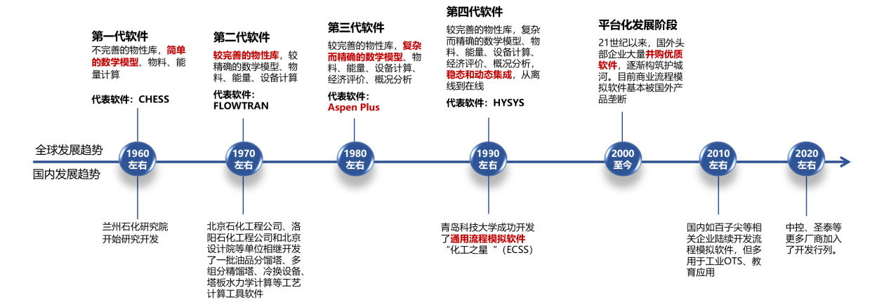 流程模擬仿真本質上是利用計算機等各種手段來模擬現實世界的實體。然而,由于仿真對象的不同,導致仿真模擬的難度和復雜度大相徑庭。回顧歷史,如圖2所示,可以發現大約在1960年左右,國內外均開始涉足這個領域。當時最早的軟件之一是CHESS,同時蘭州石化在流程模擬仿真方面也開始了相關研究,可以看到在世界范圍內涌現出了一批相當出色的工業軟件。
