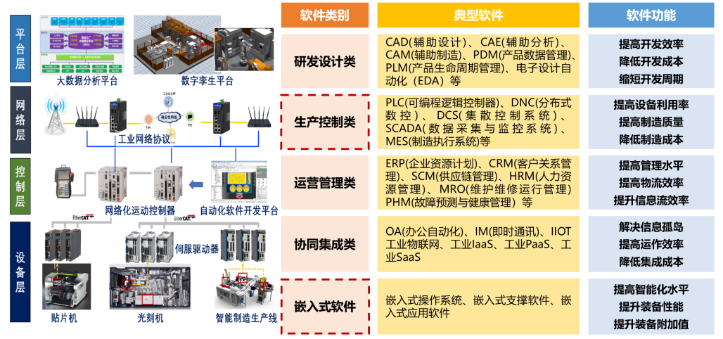 工業(yè)軟件具有多重定義,可根據(jù)其在技術(shù)層面上的定位分為五種類別,如圖1所示。首先是面向底層的嵌入式軟件,這包括嵌入式操作系統(tǒng)及其相關(guān)平臺(tái)。其次是協(xié)同集成類、研發(fā)設(shè)計(jì)類、生產(chǎn)控制類和運(yùn)營(yíng)管理類軟件,這些類型的軟件在不同階段和領(lǐng)域中扮演著重要角色。