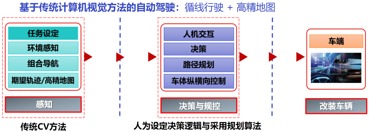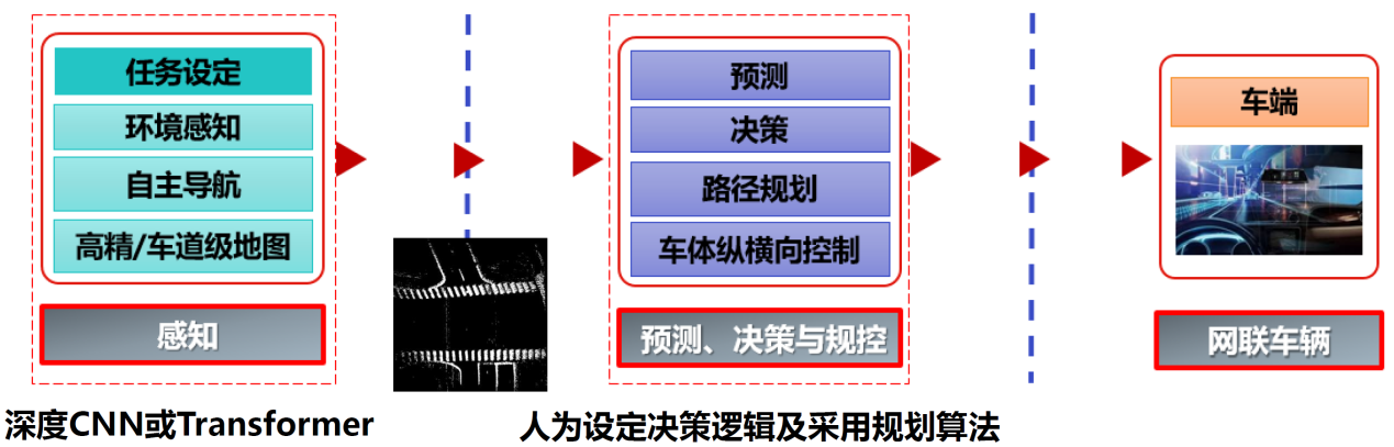 在感知部分,傳統計算機視覺方法被廣泛應用于環境感知和障礙物識別,主要依靠特征工程。在決策與規劃部分,主要包括簡單的決策和路徑規劃,特別強調車輛的縱向速度控制和橫向偏差控制。這一階段的自動駕駛系統依賴于人為設定的決策邏輯和基于規則的算法,因此被稱為自動駕駛1.0階段,如圖1所示。